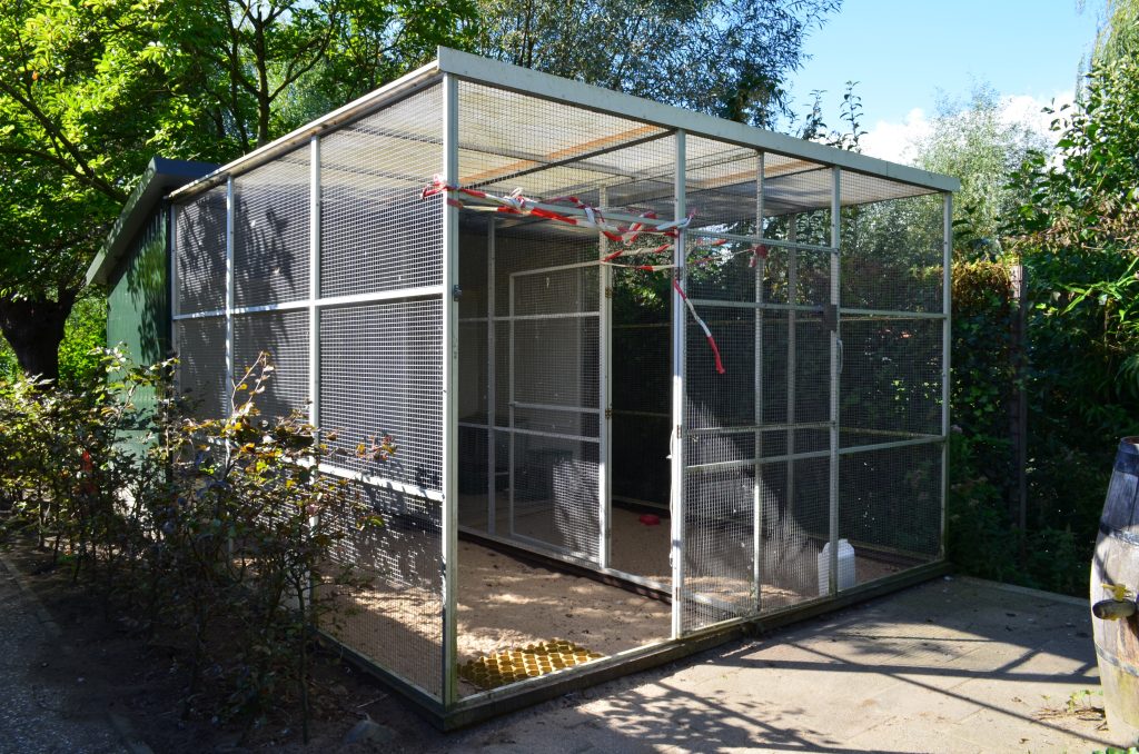 Na het maken van een grondkering en ophogen van de grond om te kunnen egaliseren, hebben we de volières in een nieuwe opstelling kunnen plaatsen.