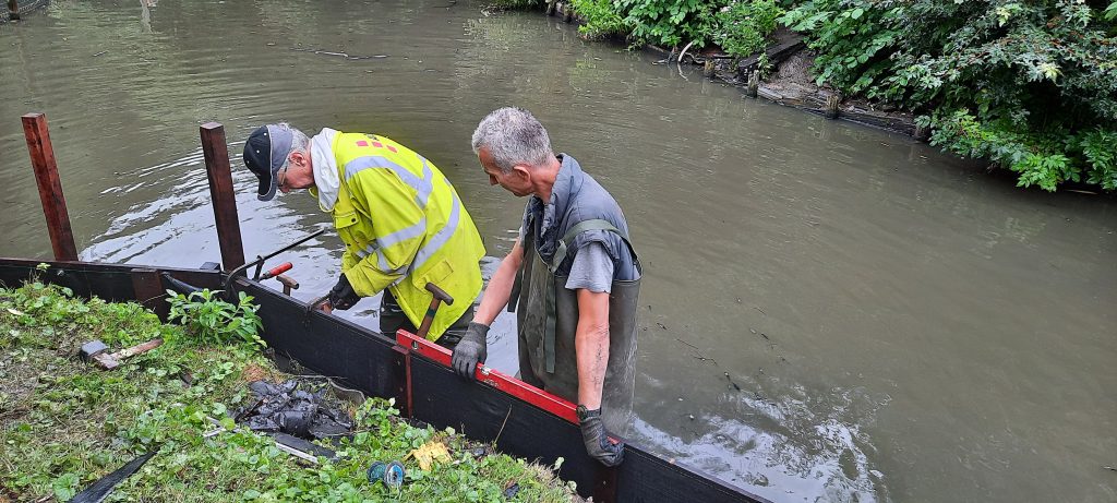 Door wegrottend hout kwamen er steeds meer lekkages in de waterkering van de vijver. Tijd om te vervangen dus! Planken, palen en oeverbeschoeiing werden besteld en daarna begon de lastige klus want er wordt deels gewerkt vanuit de vijver.